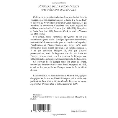 Ce livre est la première traduction française du récit de trois voyages espagnols organisés depuis le Pérou à la fin du Xvie et au début du Xviie siècles à travers l'Océan Pacifique, et qui permirent la découverte d'archipels aux noms aujourd'hui célèbres, comme les îles Salomon (en 1567-1569), Marquises et Santa Cruz (en 1595), Tuamotu, Cook du nord et Vanuatu (en 1605-1606). Son auteur, rédigea également de nombreux textes destiné à son souverain, pour le convaincre d'organiser l'exploration et l'évangélisation des terres qu'il avait découverte et qui étaient, selon lui, " un Paradis Terrestre ".