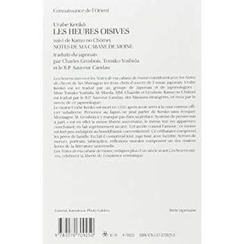 Je n'ajoute un commentaire à celui de "Rival" que pour tenter de faire monter la cote de ce livre effectivement délicieux. Ce bonhomme est vraiment touchant - alternant avec art les prêches bouddhiques, et des notations exquises sur la vie telle qu'elle passe ou repasse via instantanés et souvenirs, raillant tendrement les uns par les autres. Il parle de tout et de rien, "à sauts et à gambades", se chahute gentiment lui-même, montrant puis moquant son propre attachement à l'étiquette de Cour, par exemple. Bref, un régal de lecture, qui donne l'impression d'entrer enfin en contact avec ce que le Japon a de meilleur.