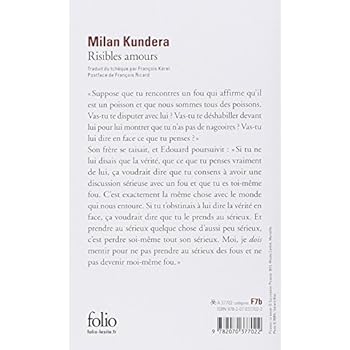 Kundera disait aussi qu'il avait trouvé sa vocation d'écrivain en écrivant ces nouvelles qui sont « le point de départ de toute son entreprise romanesque». Les thèmes principaux y annoncent d'ailleurs les grands thèmes des romans suivants.Le titre, « Risibles amours », résume bien ce décalage qu'il observe entre l'idée de l'amour que le mensonge romantique lie toujours au sérieux, et le constat que « ...l'aventure amoureuse était dérisoire, faite de hasards et d'erreurs, dépourvue de sérieux et de sens ». Ce décalage, l'auteur le montre aussi entre le sérieux avec lequel ses personnages se représentent eux-mêmes, et les pitreries dans lesquelles ils s'embarquent malgré eux, comme « imposées de l'extérieur ; qu'elles ne les caractérisent en aucune manière ; qu'ils ne sont nullement responsables de leurs cours étrange ; qu'elles les entrainent, étant elles mêmes dirigées on ne sait d'où par on ne sait quelles forces étrangères.» Pourquoi se prêtent-ils à un jeu dont les règles et la finalité leur échappent? Parce qu'« il se disait que tous ces gens qu'il côtoyait n'étaient que des êtres aux attitudes interchangeables, sans substance solide ; mais ce qui est pire, c'est qu'il n'est que lui-même l'ombre des ces personnages-ombres, car il épuisait toutes les ressources de son intelligence dans le seul dessein de s'adapter à eux et de les imiter' ». Même si l'amour est aliénant, ses personnages ne peuvent se passer d'exister à travers le regard des autres.Dans « Les Testaments trahis » Kundera disait ; « la seule chose que je désirais alors profondément, avidement, c'était un regard lucide et désabusé. Je l'ai trouvé enfin dans l'art du roman. » C'est donc lorsqu'on adopte vis-à-vis de soi-même ce regard lucide et désabusé qui est le sien qu'on arrive à se retirer du jeu. Le thème du retrait du jeu sera plus tard repris dans « L'insoutenable légèreté de l'être », quand Kundera définira la folie de Nietzsche, comme un retrait du monde : « Cela se passait en 1889 et Nietzsche s'était déjà éloigné, lui aussi, des hommes'Et c'est ce Nietzsche-là que j'aime, de même que j'aime Tereza'Je les vois tous les deux côte à côte : ils s'écartent tous les deux de la route où l'humanité, maître et possesseur de la nature, poursuit sa marche en avant. » Le retrait du jeu, ou la distance prise par rapport à la situation, est également présente dans la forme narrative, avec des effets rhétoriques comme ; « Réfléchissons un instant' » qui ont pour effet d'immobiliser l'action et d'enclencher un autre mode de narration, celui de la distanciation.